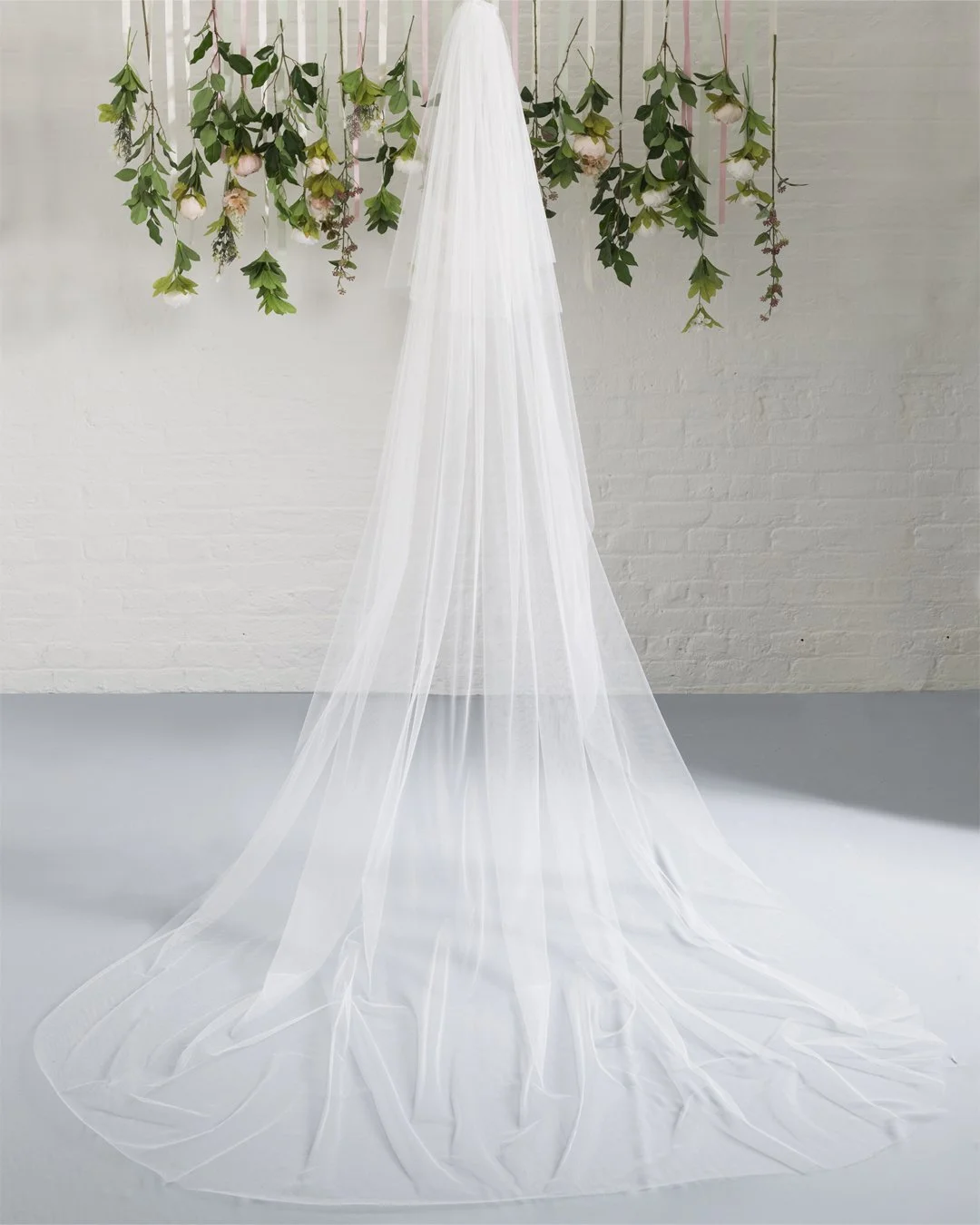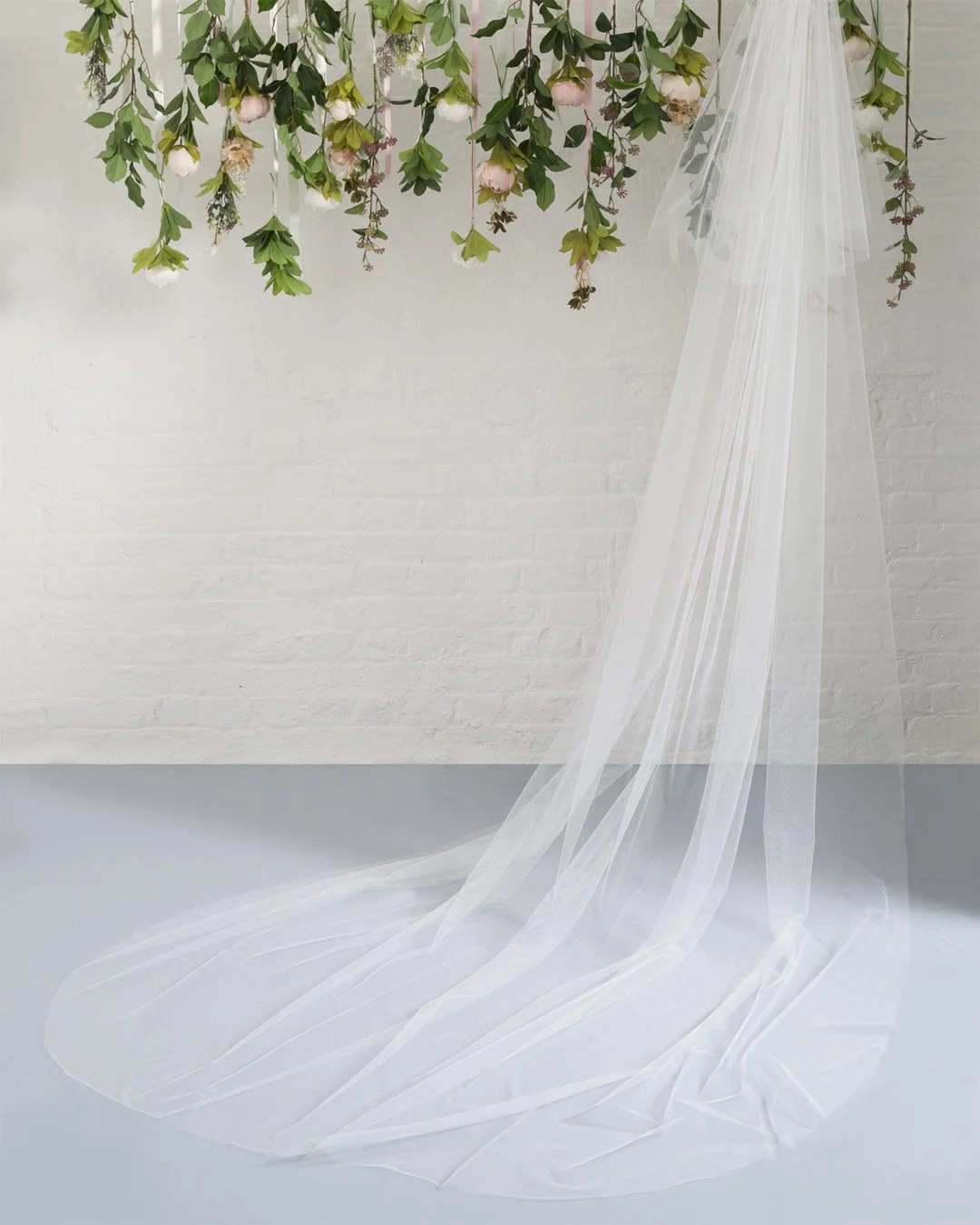 A white sheer veil hanging from pink ribbons, with green leaves and pink flowers hanging above, against a white brick wall.