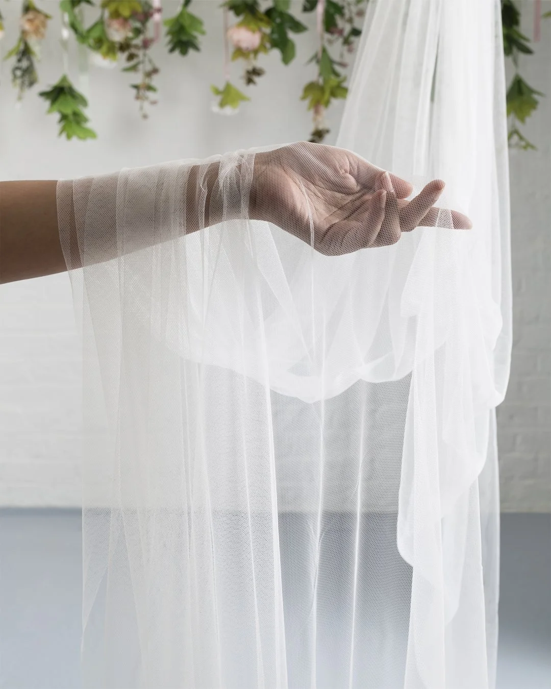 A person wearing a sheer glove touching a sheer white curtain with a background of plants and a white brick wall.