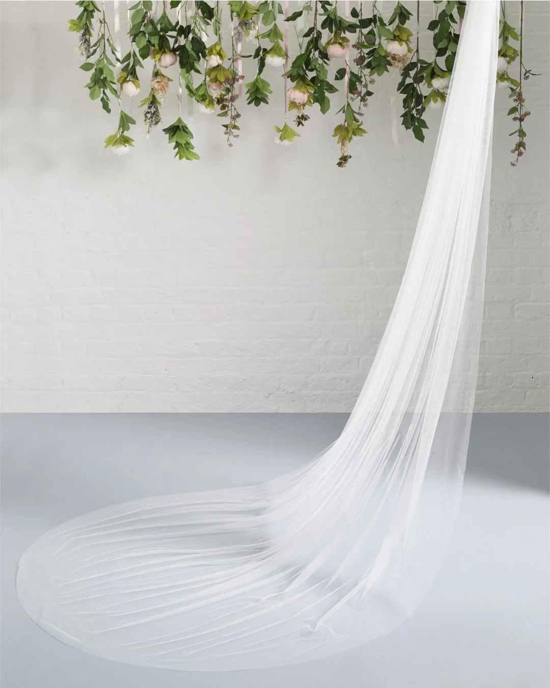 A long, flowing, sheer white fabric drapes from ceiling to floor, creating a soft, elegant look against a white brick wall with hanging greenery and pink flowers above.